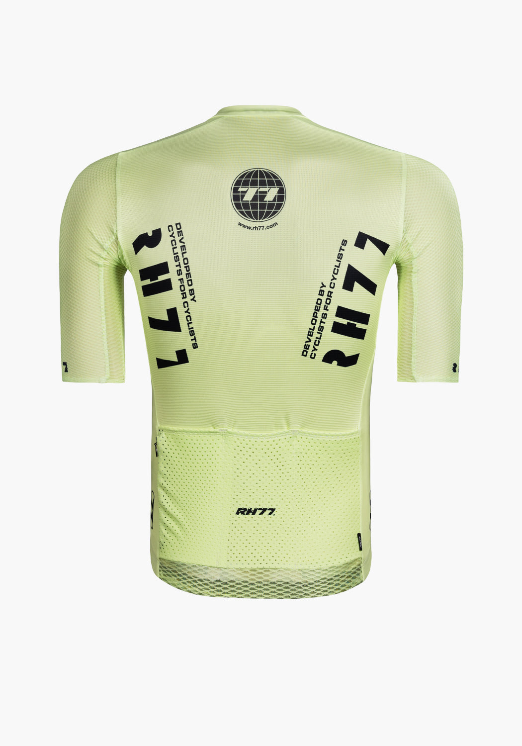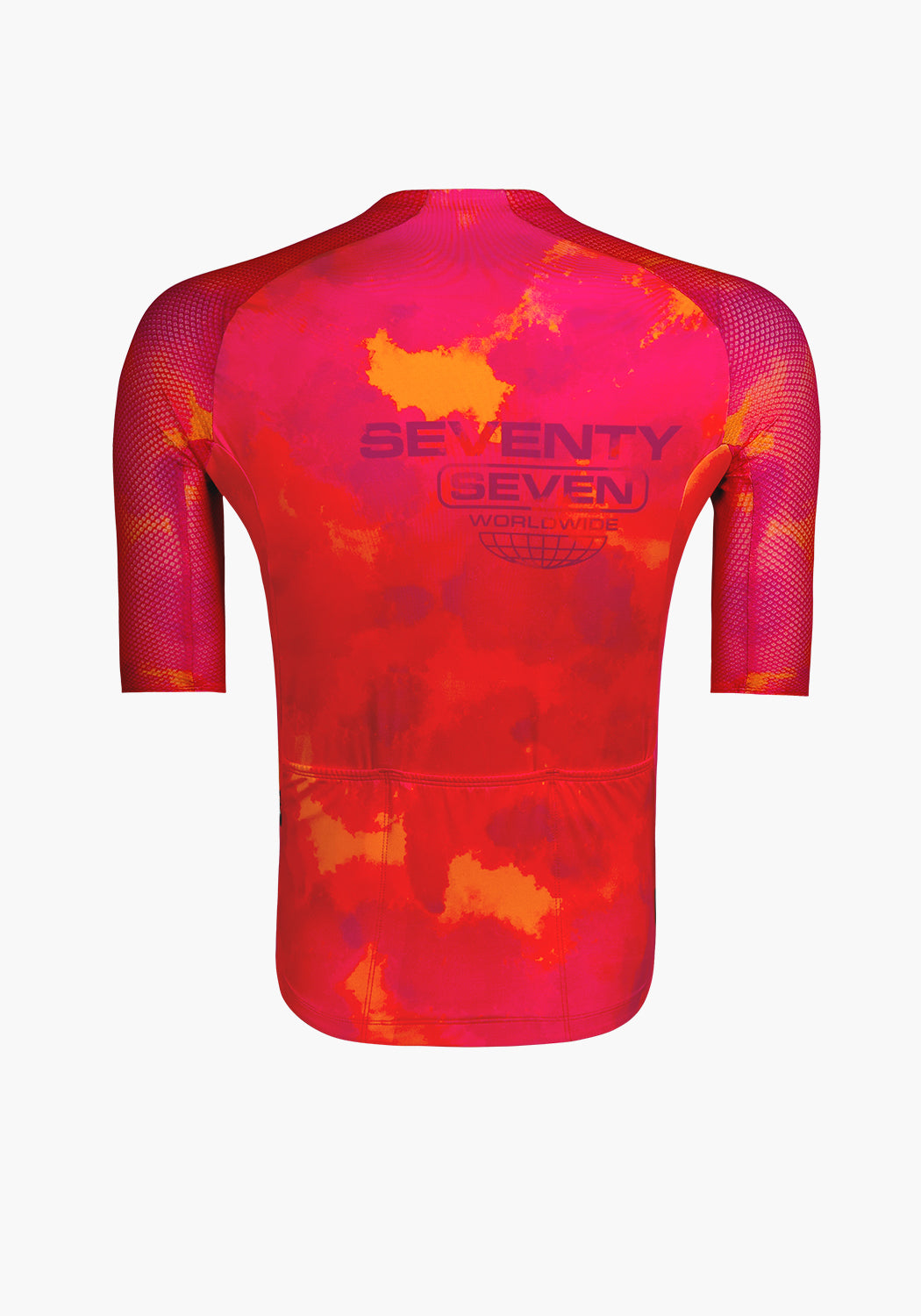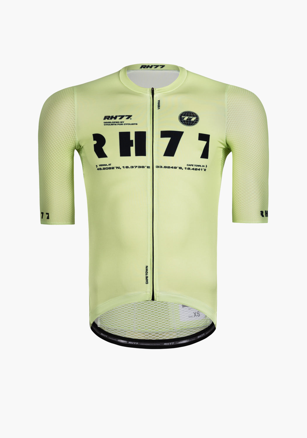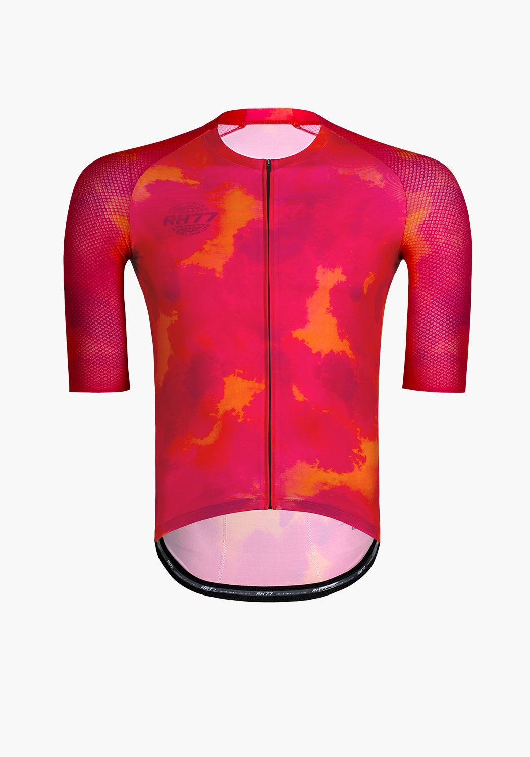The latest evolution of our aero Jersey is a construction of lightweight lycra fabrics with exceptional elasticity, breathability, and moisture-wicking properties. The combination of no side panels and fabrics provide a snug yet flexible fit, allowing cyclists to move freely without restriction. The newly developed collar, which is bonded at the front of the jersey using a special technique gives a streamlined silhouette. The sleeves feature a textured performance fabric with a structured, mesh-like design. This material includes subtle rectangular perforations that enhance ventilation and airflow, helping to regulate body temperature during intense efforts without compromising on aerodynamics.