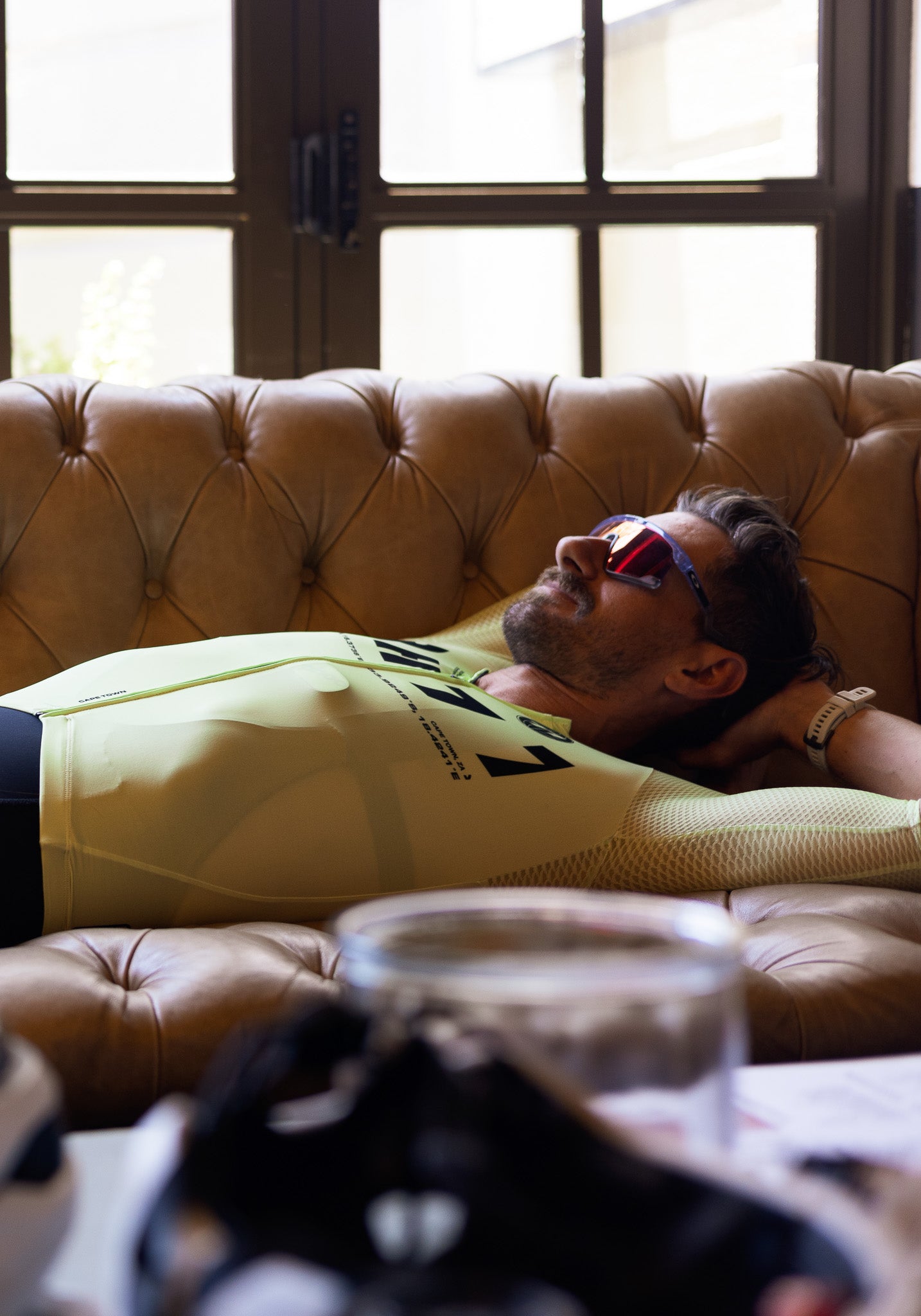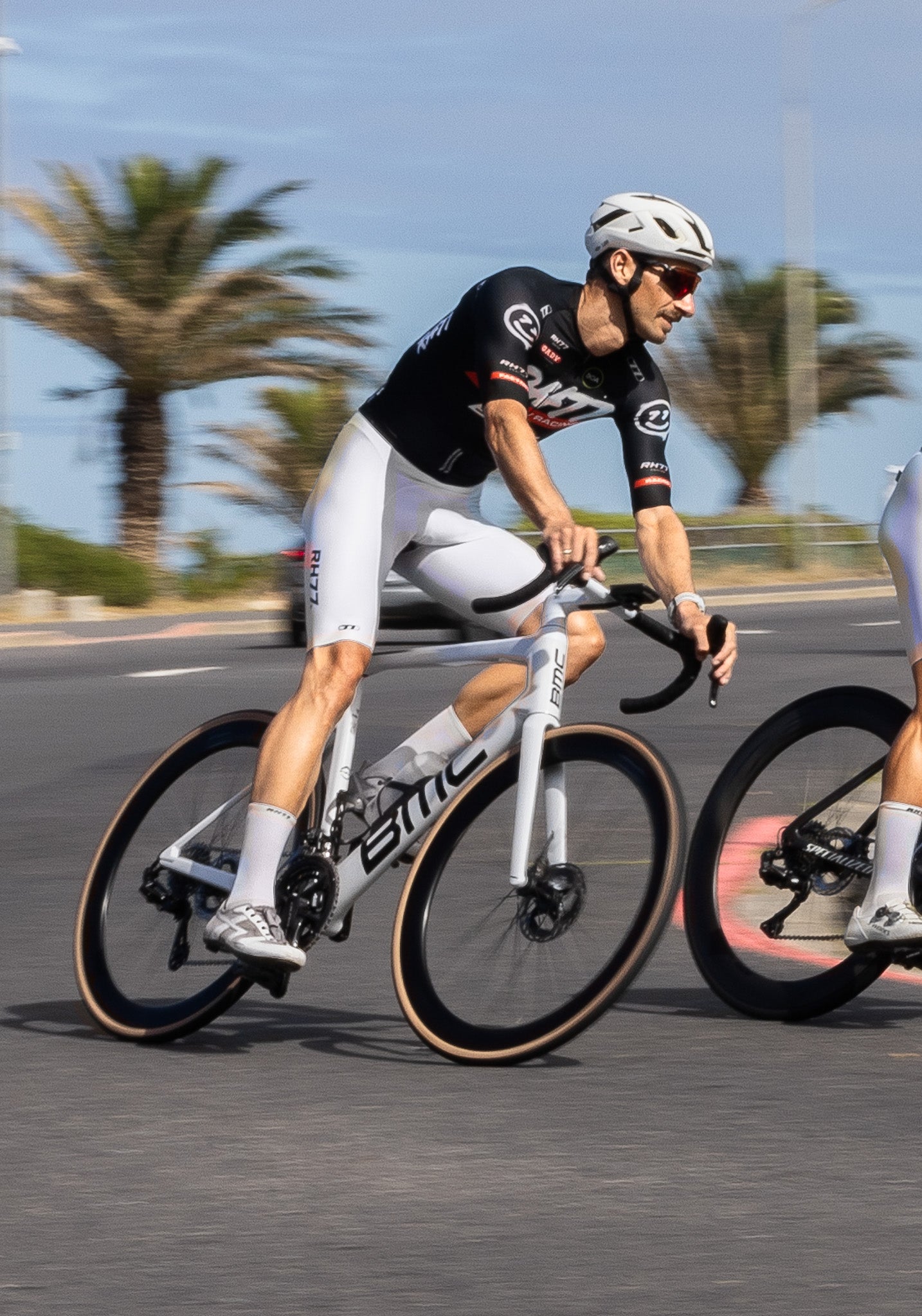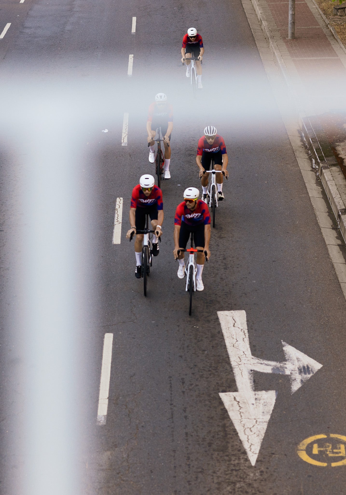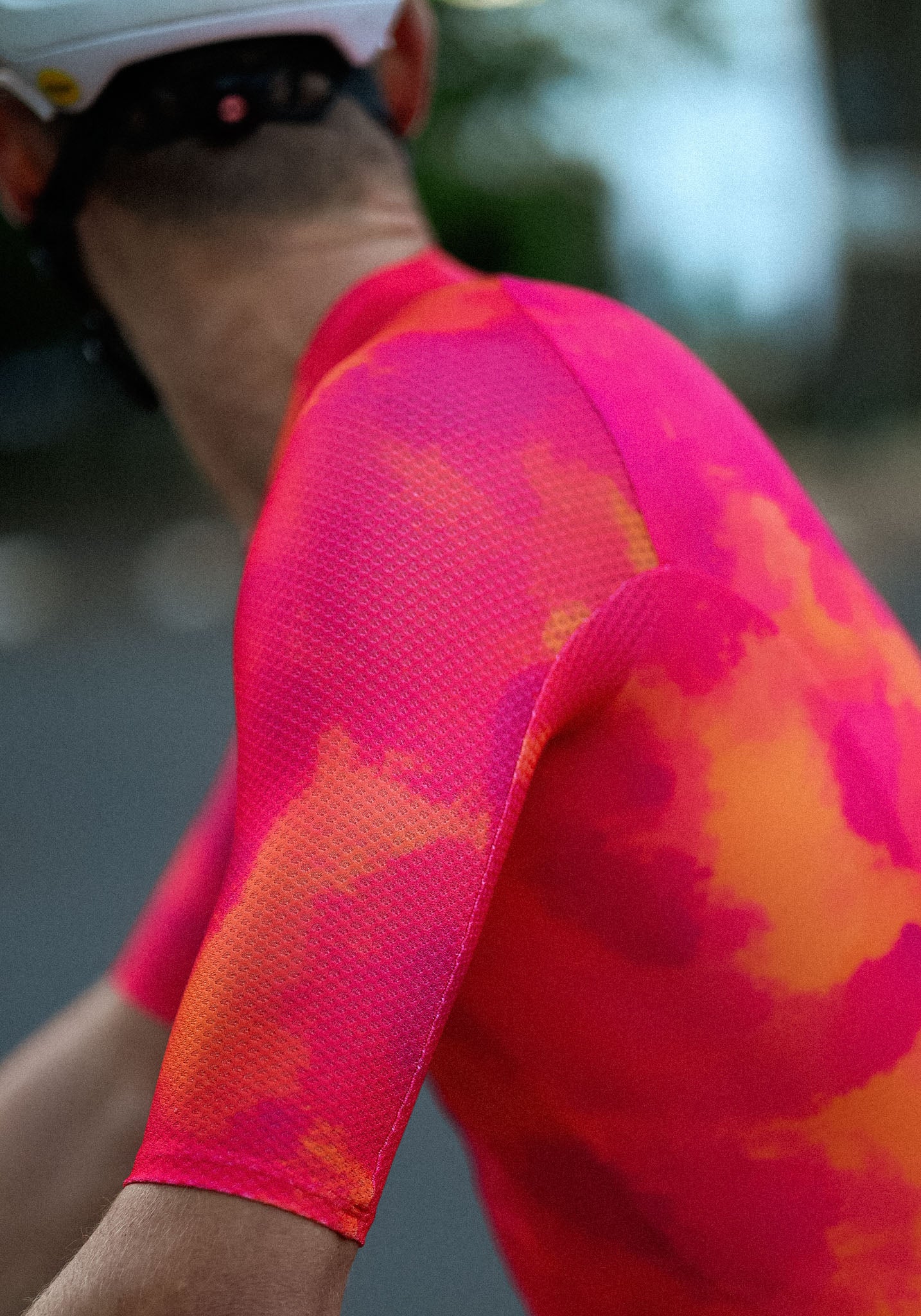 The latest evolution of our aero Jersey is a construction of lightweight lycra fabrics with exceptional elasticity, breathability, and moisture-wicking properties. The combination of no side panels and fabrics provide a snug yet flexible fit, allowing cyclists to move freely without restriction. The newly developed collar, which is bonded at the front of the jersey using a special technique gives a streamlined silhouette. The sleeves feature a textured performance fabric with a structured, mesh-like design. This material includes subtle rectangular perforations that enhance ventilation and airflow, helping to regulate body temperature during intense efforts without compromising on aerodynamics.