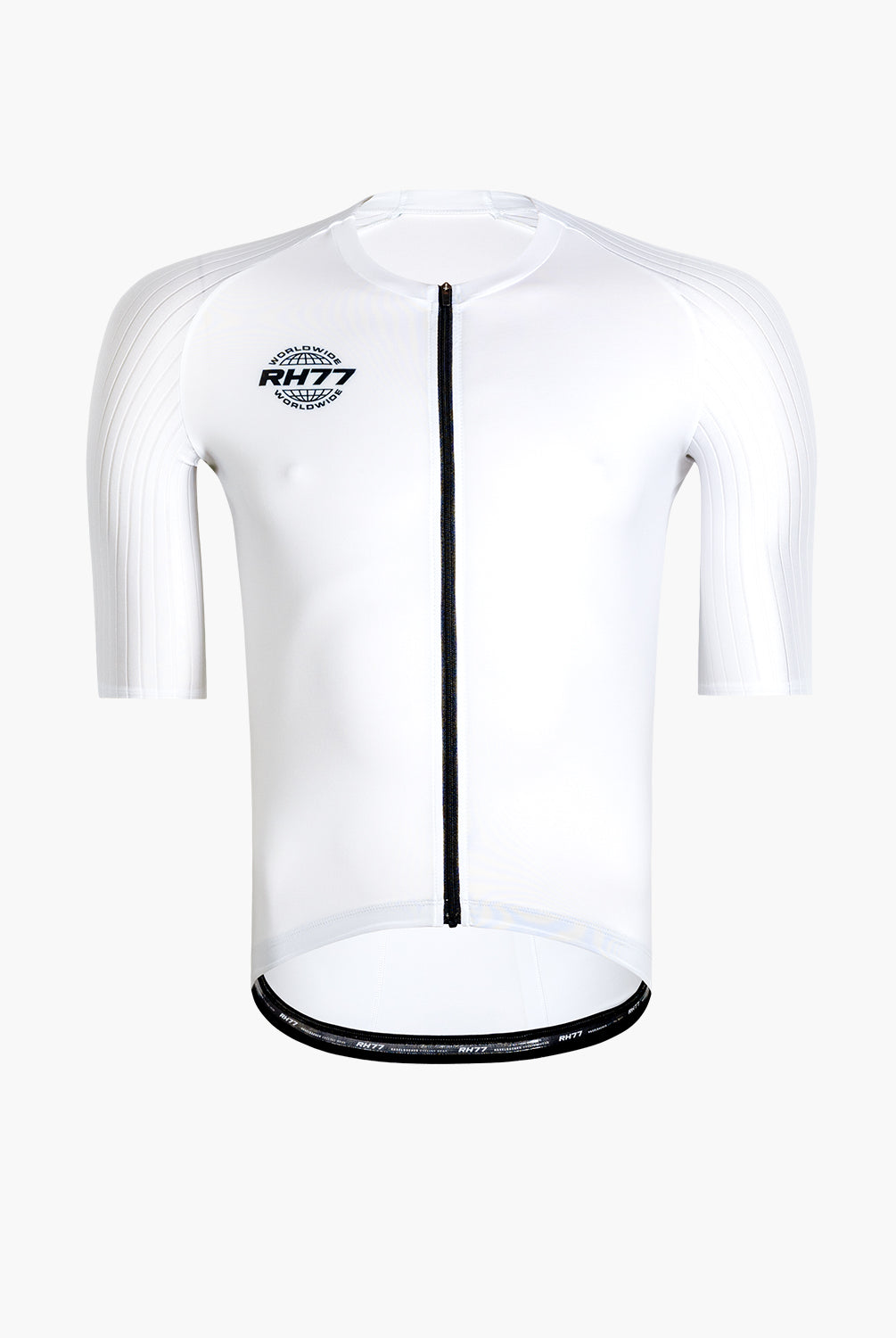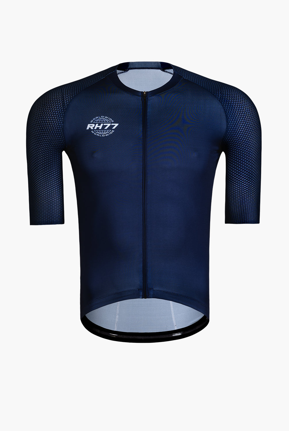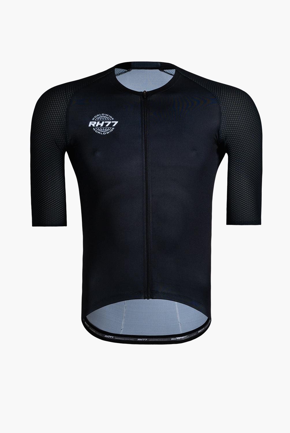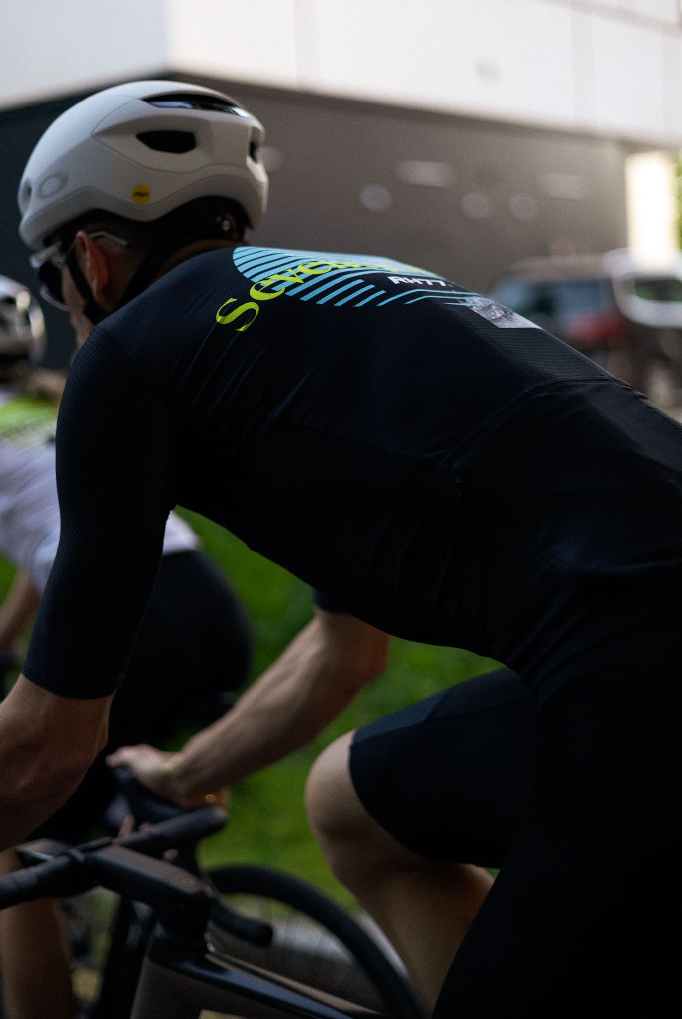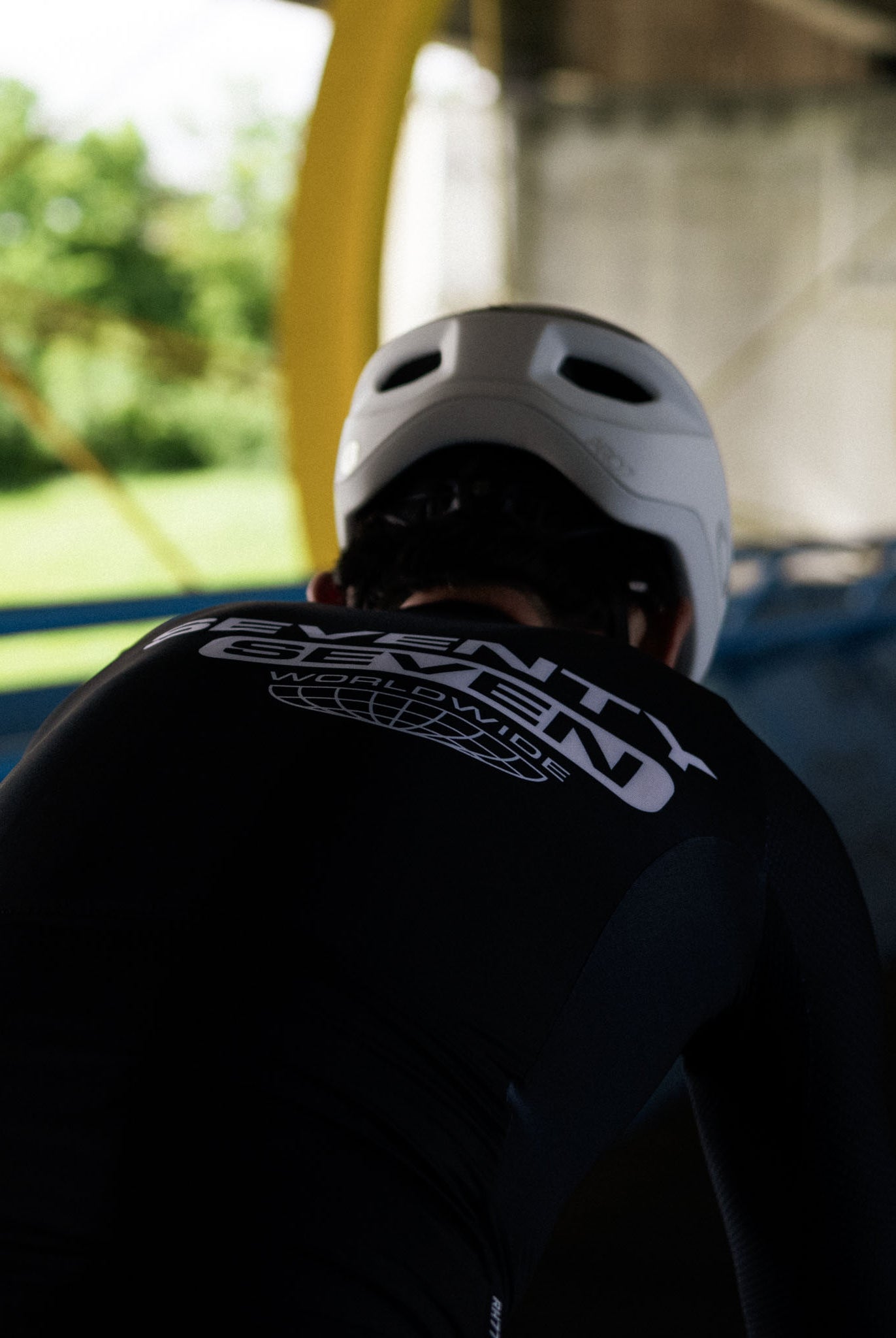 The latest evolution of our aero Jersey is a construction of lightweight lycra fabrics with exceptional elasticity, breathability, and moisture-wicking properties. The combination of no side panels and fabrics provide a snug yet flexible fit, allowing cyclists to move freely without restriction. The newly developed collar, which is bonded at the front of the jersey using a special technique gives a streamlined silhouette. The sleeves feature a textured performance fabric with a structured, mesh-like design. This material includes subtle rectangular perforations that enhance ventilation and airflow, helping to regulate body temperature during intense efforts without compromising on aerodynamics.