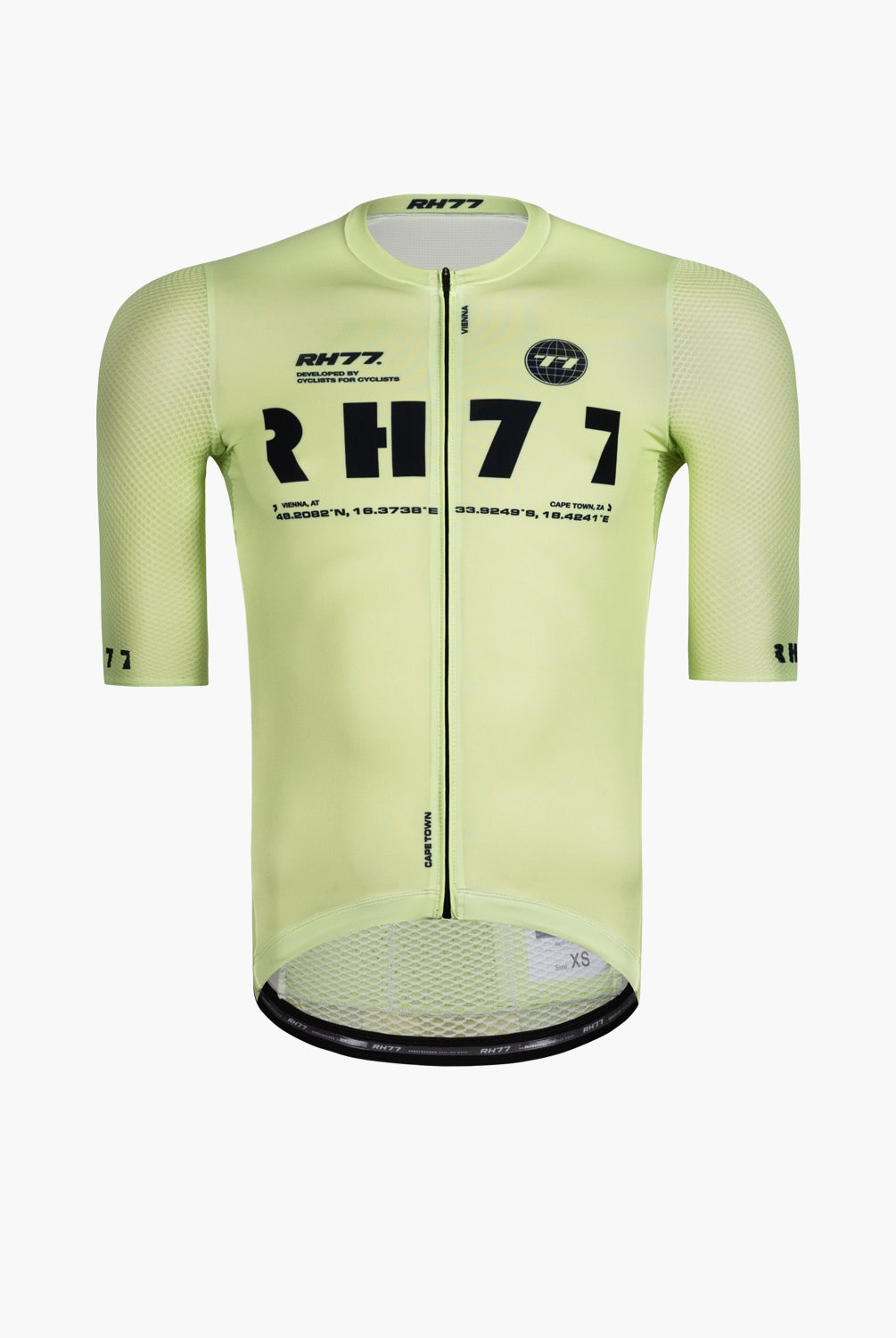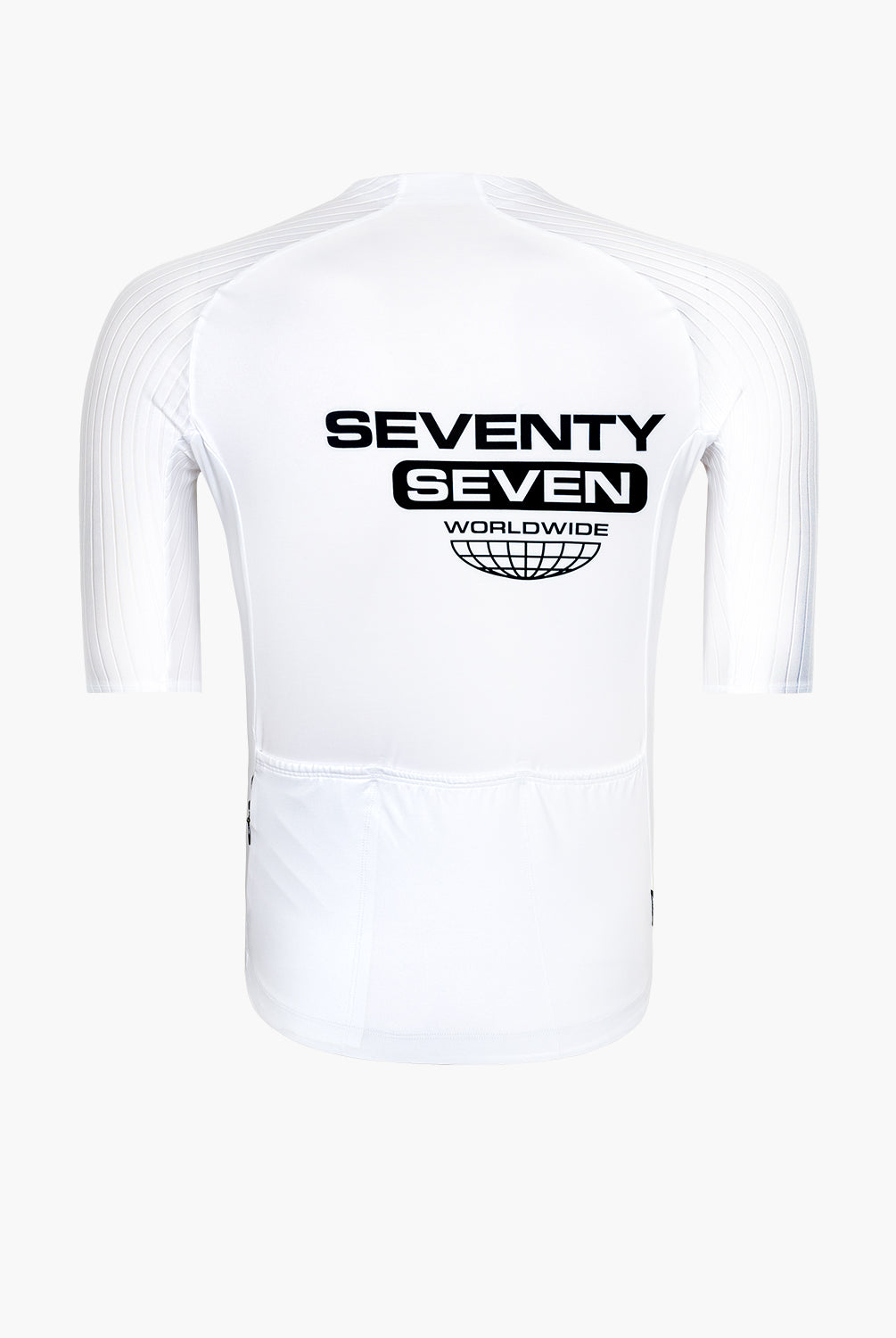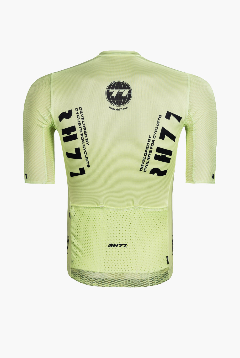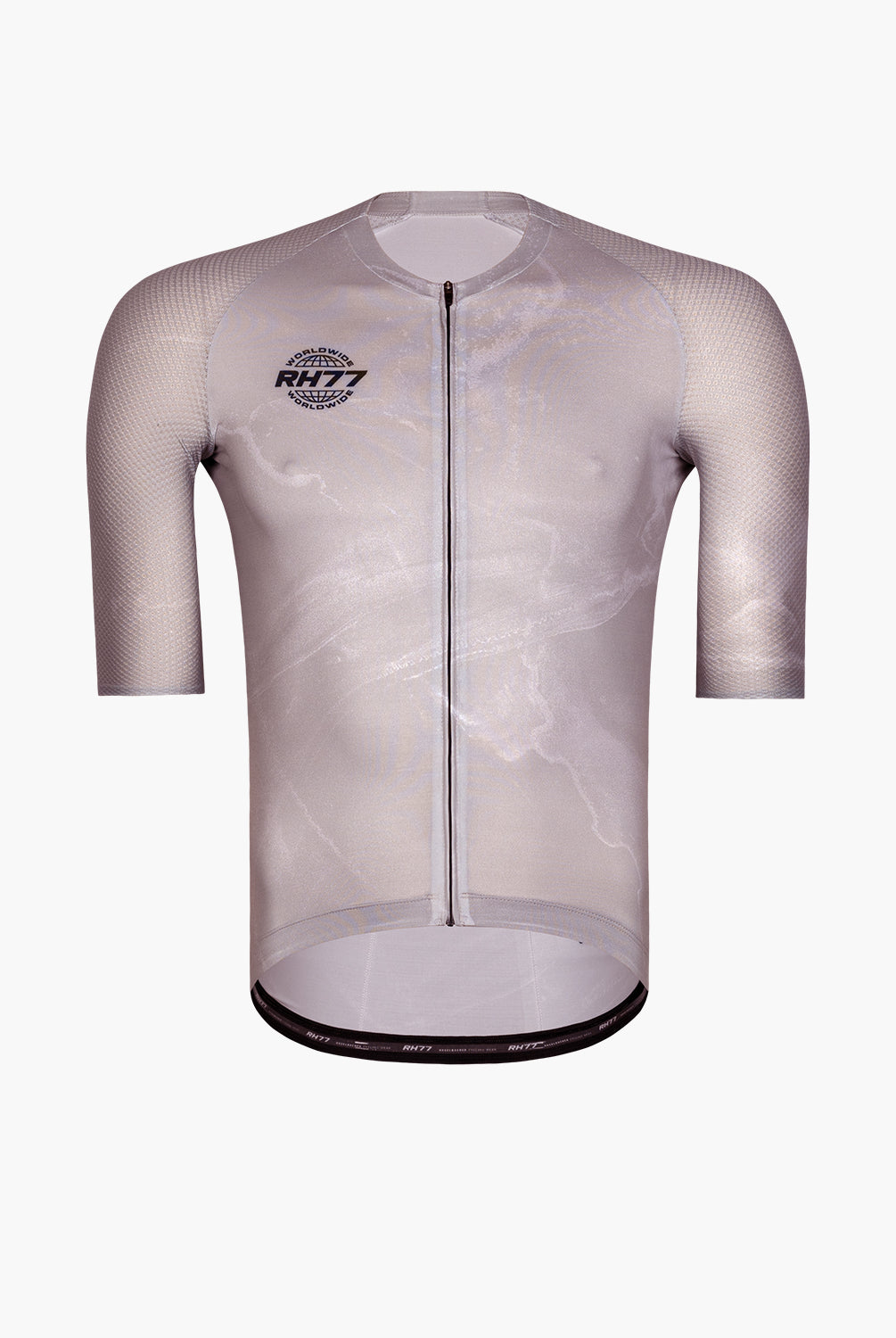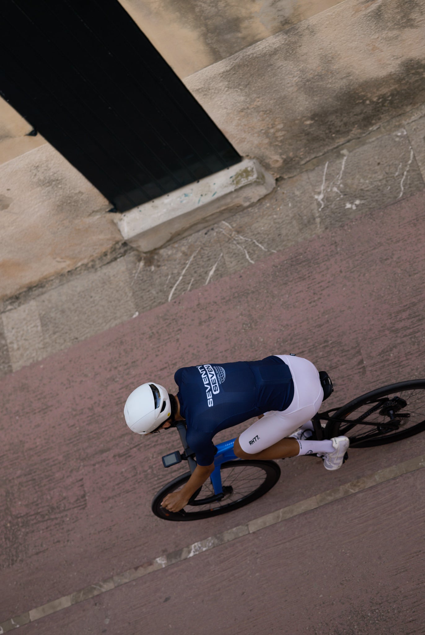 The latest evolution of our aero Jersey is a construction of lightweight lycra fabrics with exceptional elasticity, breathability, and moisture-wicking properties. The combination of no side panels and fabrics provide a snug yet flexible fit, allowing cyclists to move freely without restriction. The newly developed collar, which is bonded at the front of the jersey using a special technique gives a streamlined silhouette. The sleeves feature a textured performance fabric with a structured, mesh-like design. This material includes subtle rectangular perforations that enhance ventilation and airflow, helping to regulate body temperature during intense efforts without compromising on aerodynamics.
