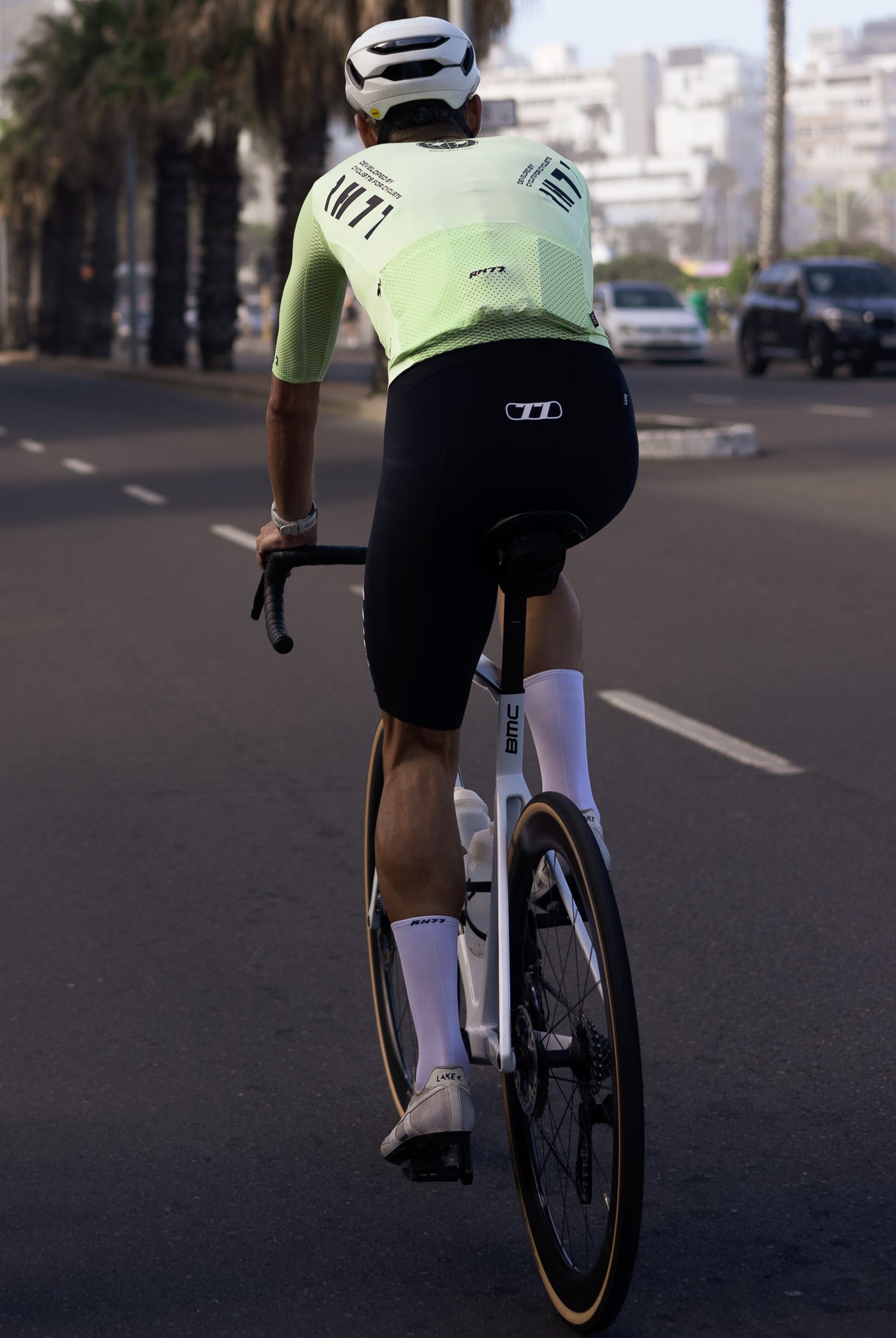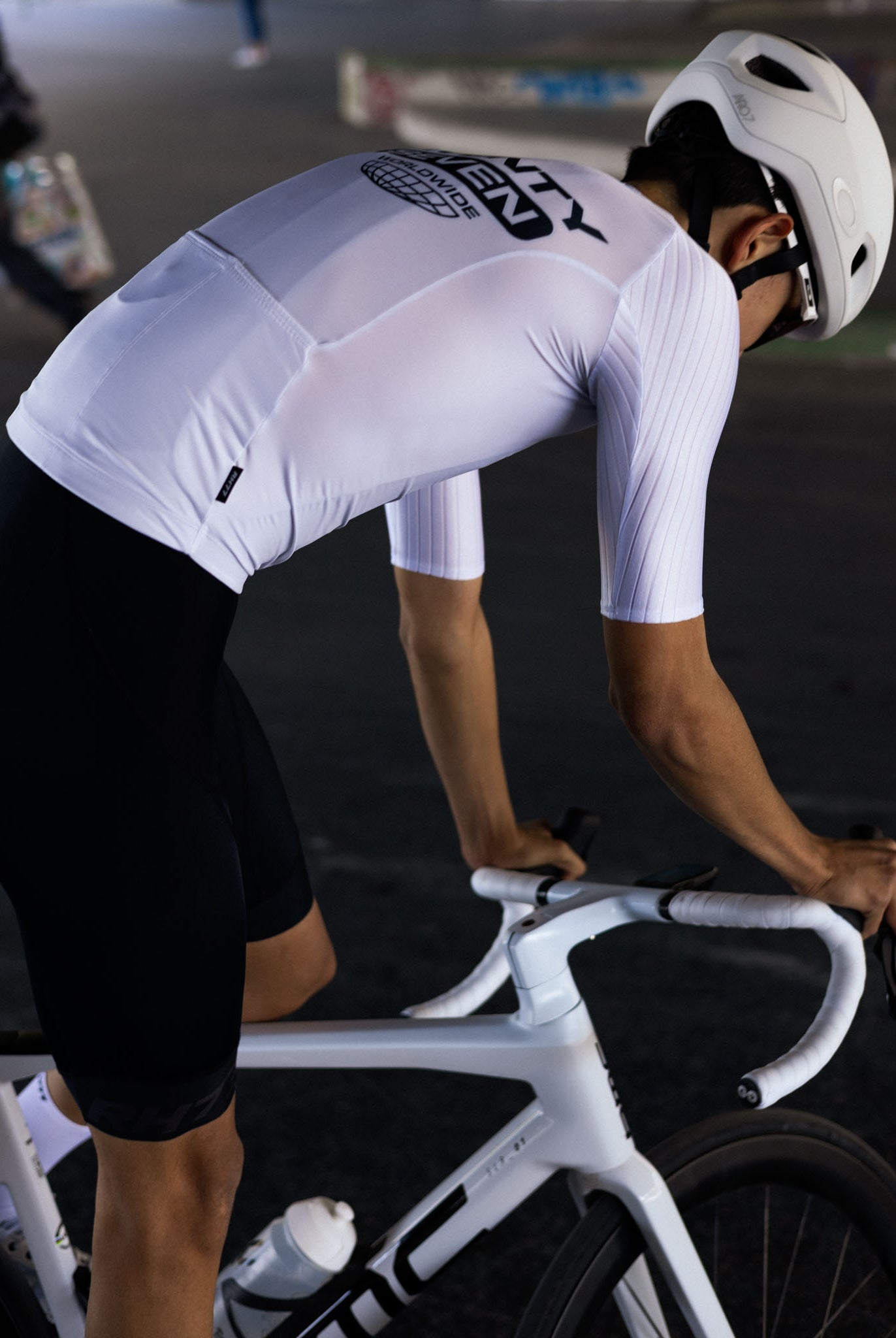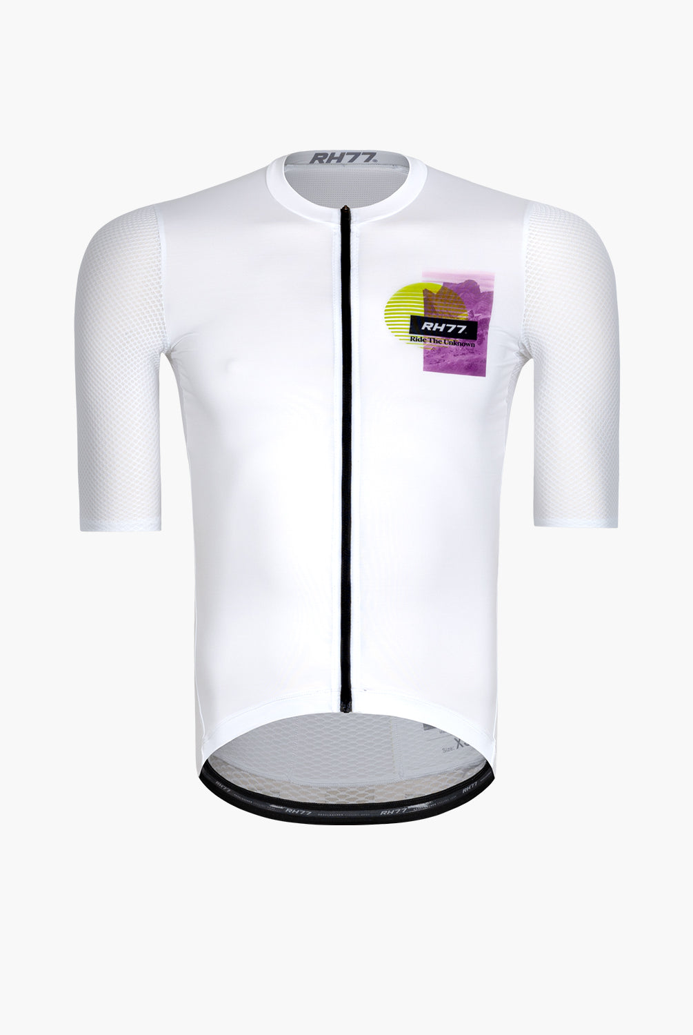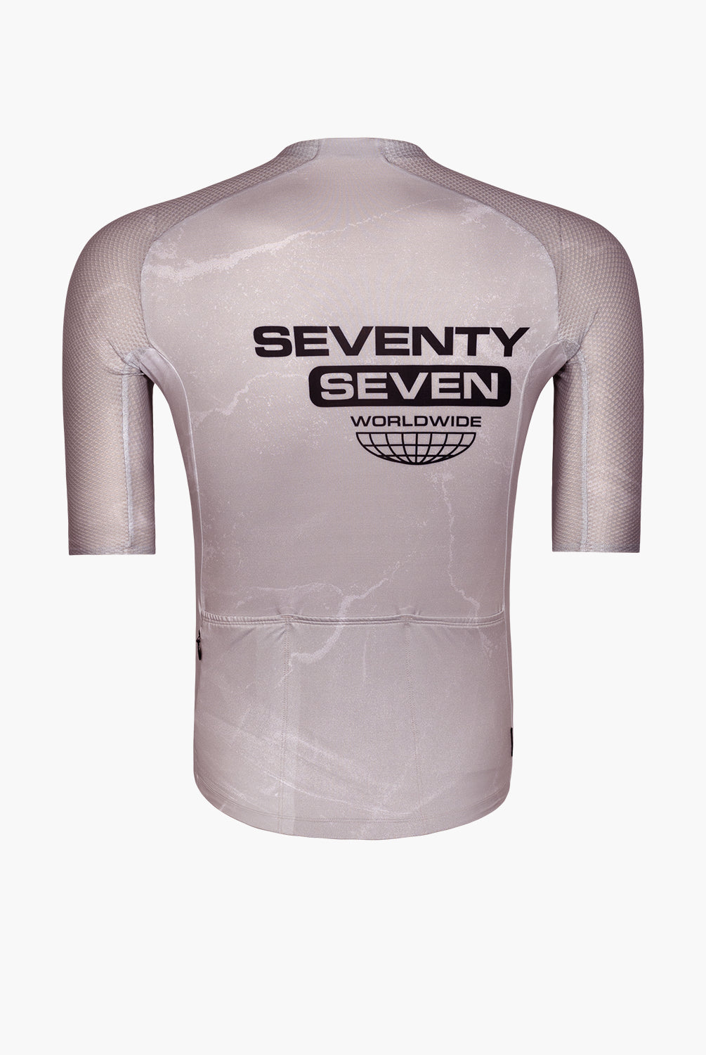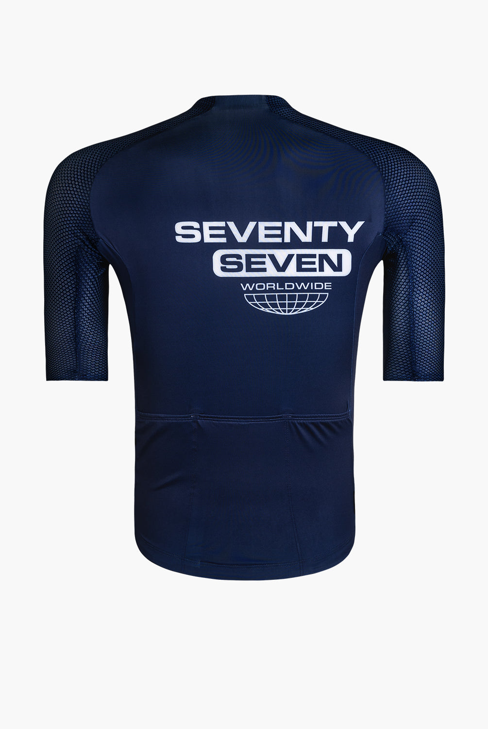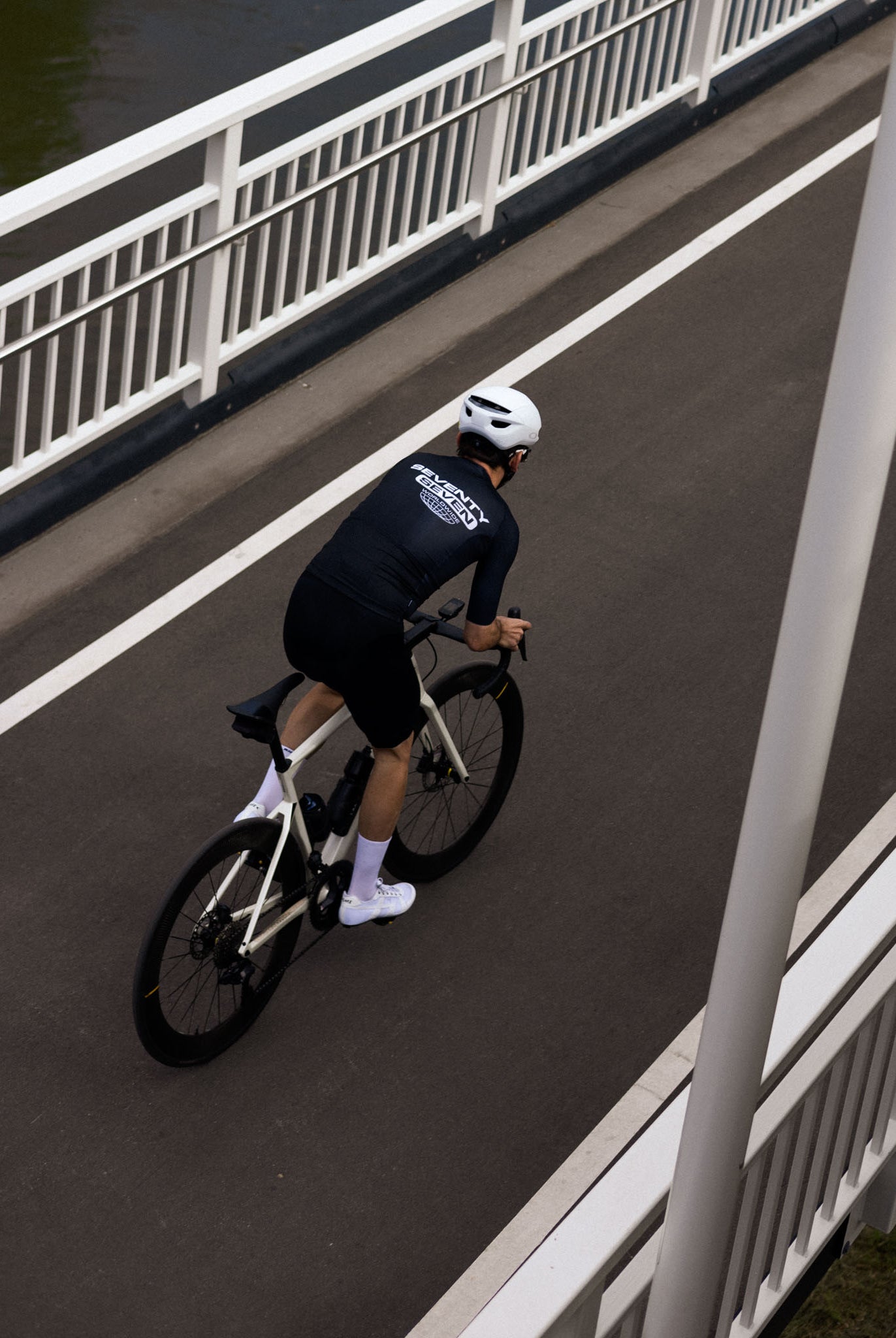 The latest evolution of our aero Jersey is a construction of lightweight lycra fabrics with exceptional elasticity, breathability, and moisture-wicking properties. The combination of no side panels and fabrics provide a snug yet flexible fit, allowing cyclists to move freely without restriction. The newly developed collar, which is bonded at the front of the jersey using a special technique gives a streamlined silhouette. The sleeves feature a textured performance fabric with a structured, mesh-like design. This material includes subtle rectangular perforations that enhance ventilation and airflow, helping to regulate body temperature during intense efforts without compromising on aerodynamics.