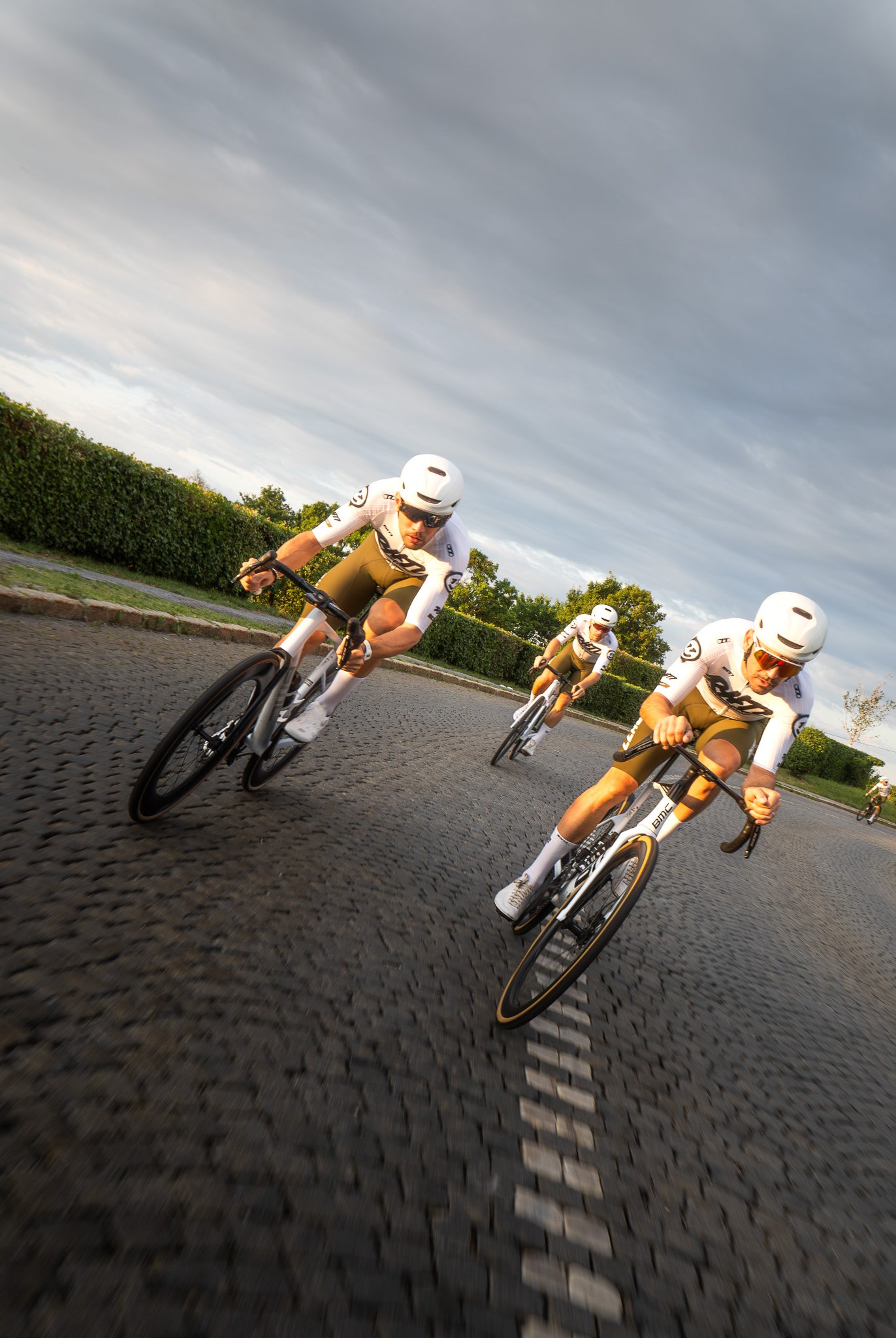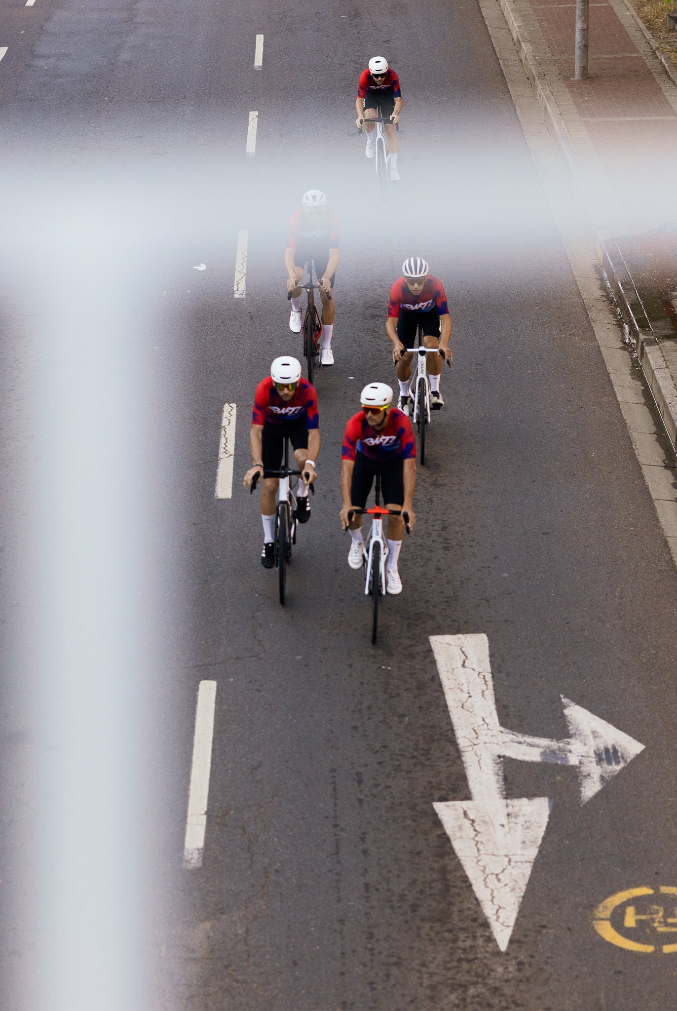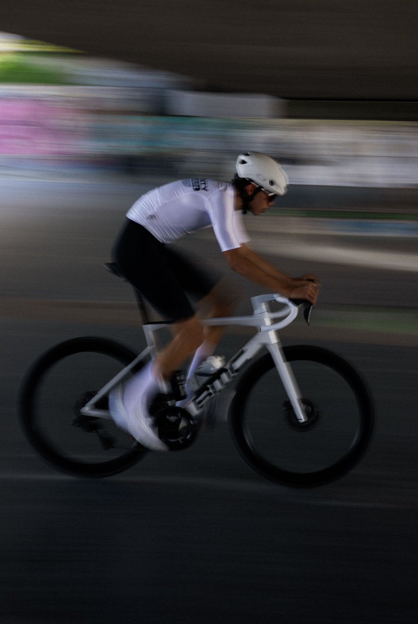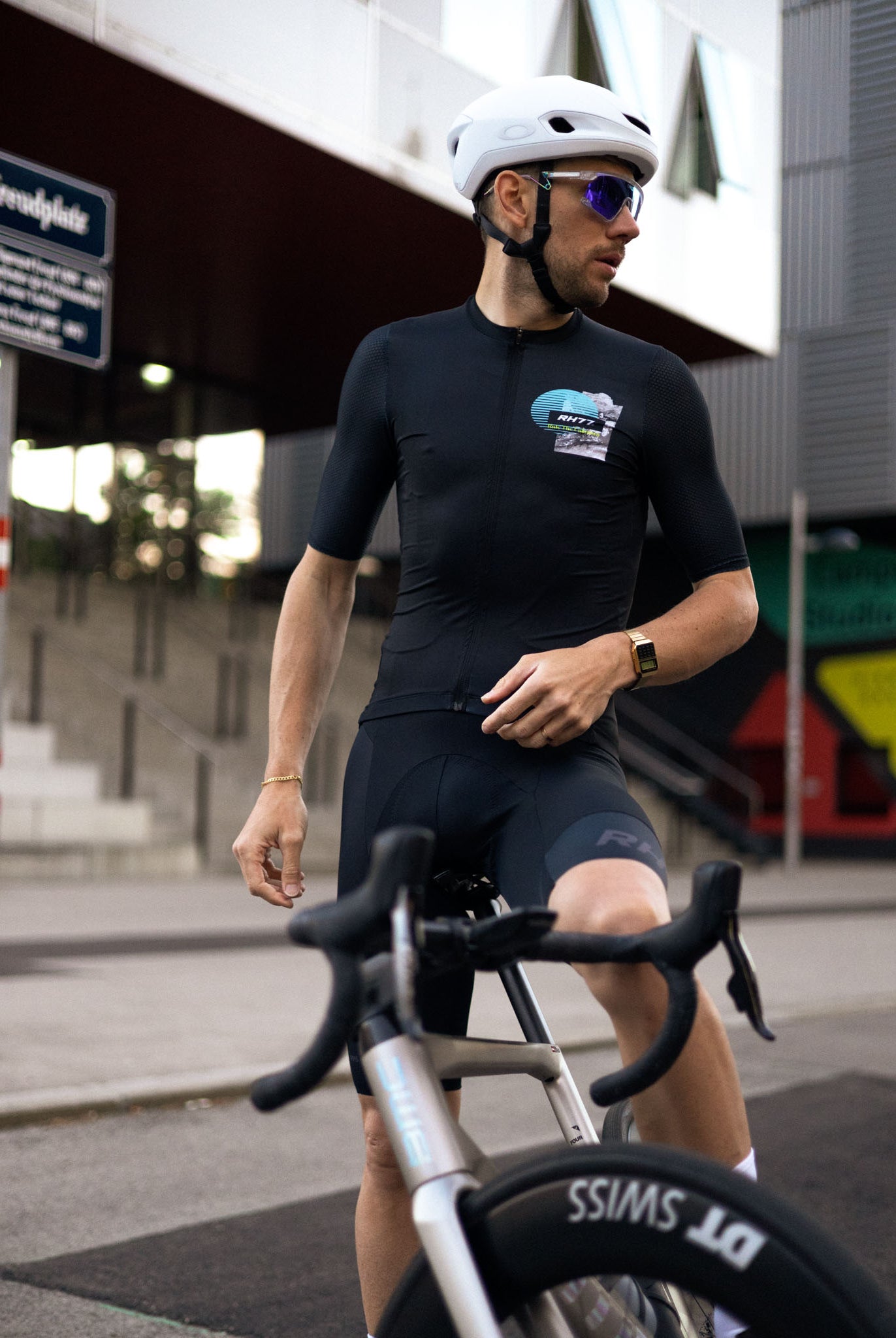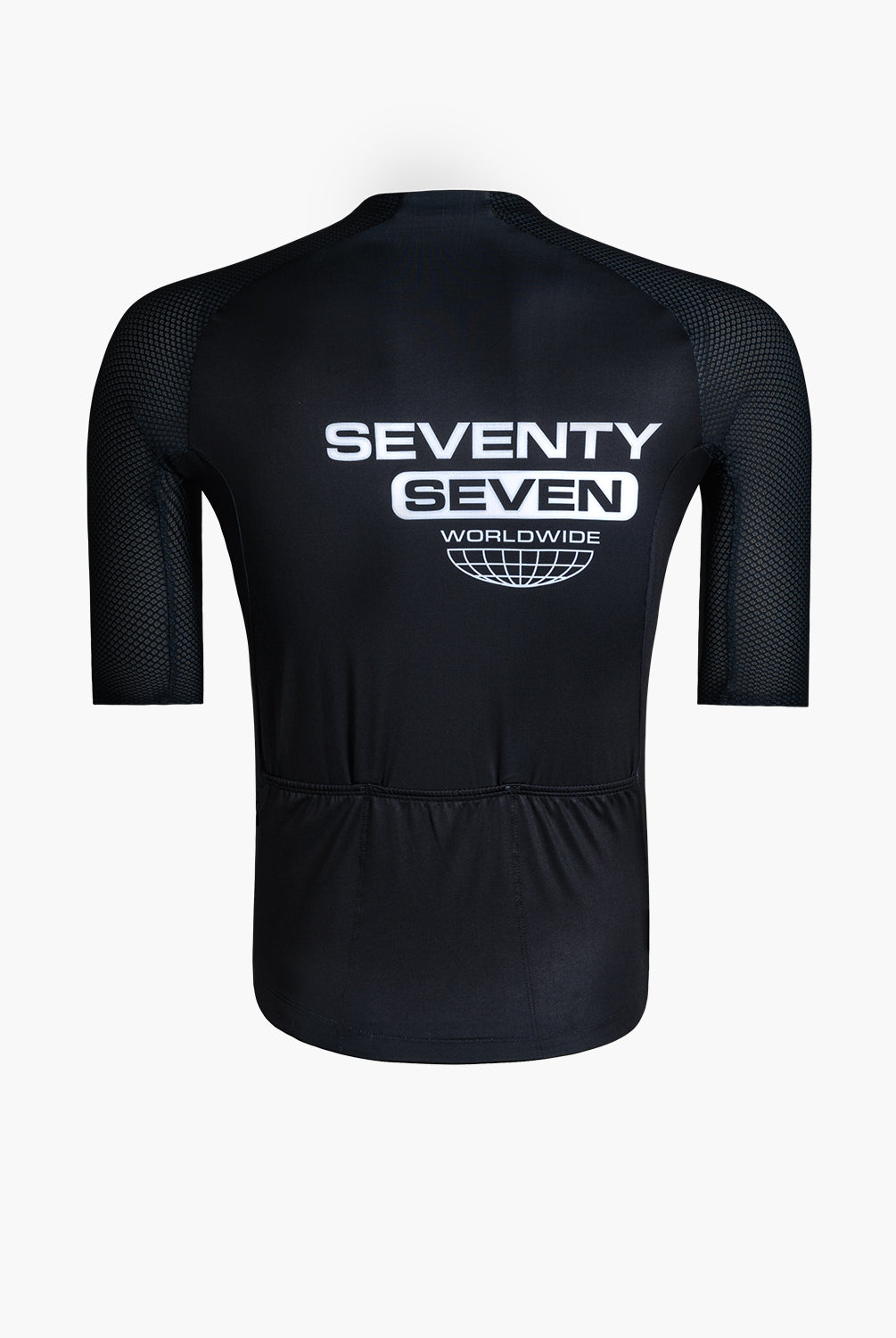 The latest evolution of our aero Jersey is a construction of lightweight lycra fabrics with exceptional elasticity, breathability, and moisture-wicking properties. The combination of no side panels and fabrics provide a snug yet flexible fit, allowing cyclists to move freely without restriction. The newly developed collar, which is bonded at the front of the jersey using a special technique gives a streamlined silhouette. The sleeves feature a textured performance fabric with a structured, mesh-like design. This material includes subtle rectangular perforations that enhance ventilation and airflow, helping to regulate body temperature during intense efforts without compromising on aerodynamics.