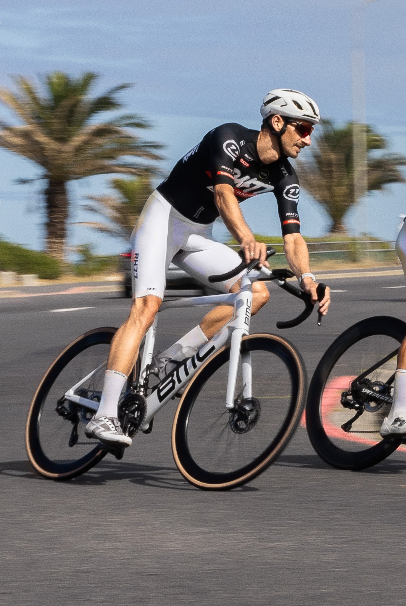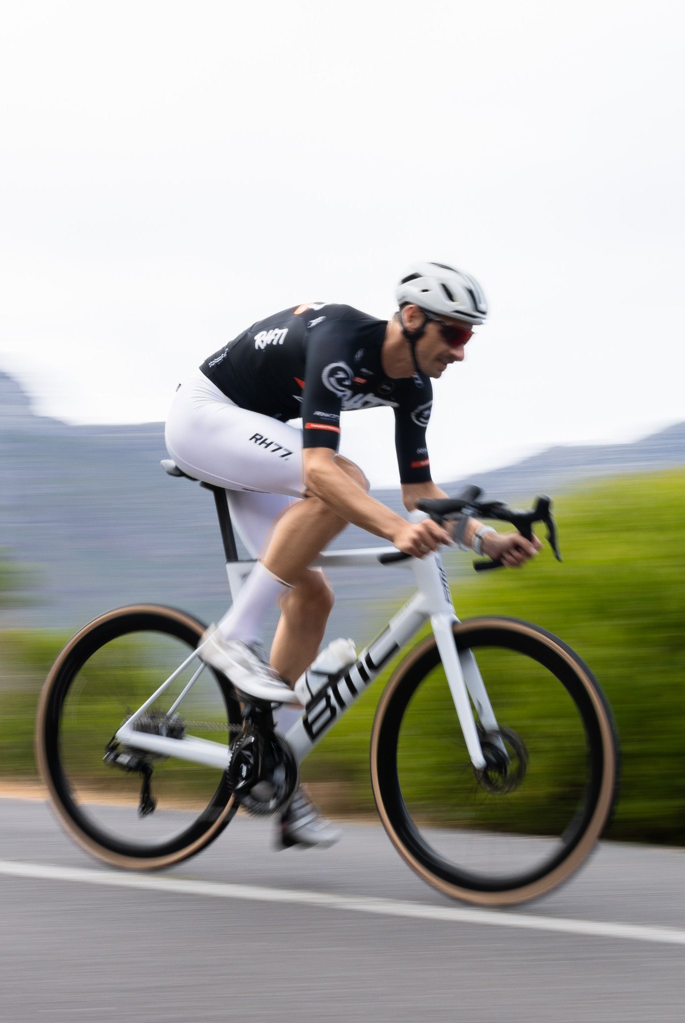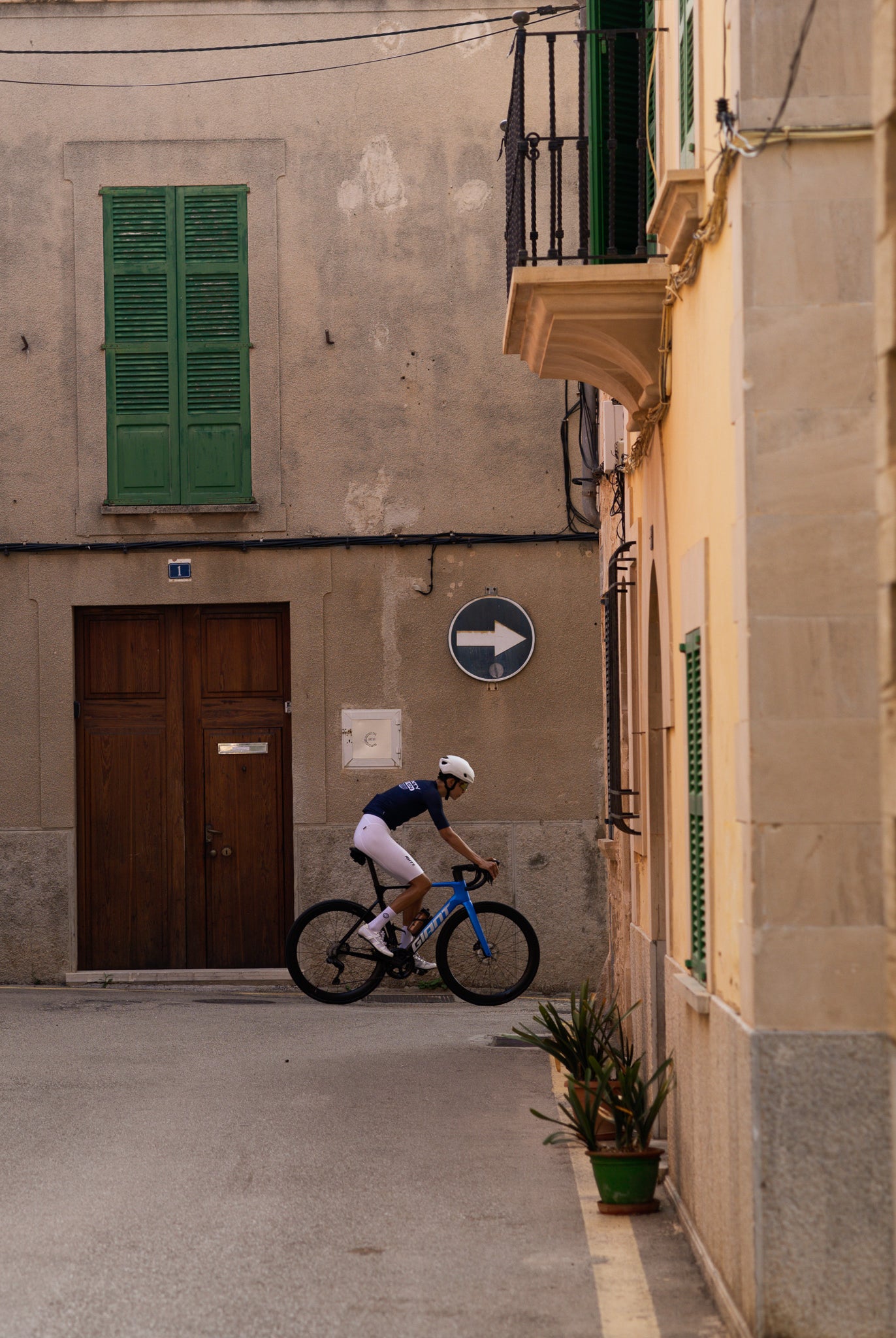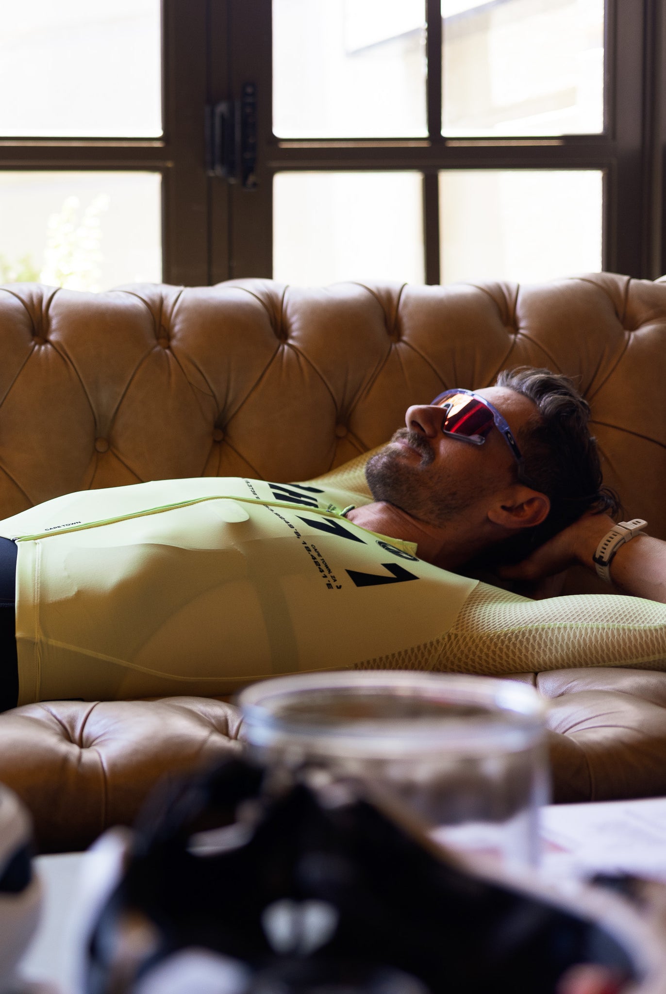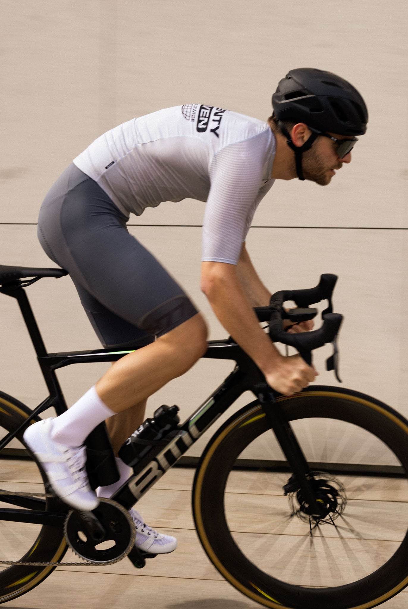 The latest evolution of our aero Jersey is a construction of lightweight lycra fabrics with exceptional elasticity, breathability, and moisture-wicking properties. The combination of no side panels and fabrics provide a snug yet flexible fit, allowing cyclists to move freely without restriction. The newly developed collar, which is bonded at the front of the jersey using a special technique gives a streamlined silhouette. The sleeves feature a textured performance fabric with a structured, mesh-like design. This material includes subtle rectangular perforations that enhance ventilation and airflow, helping to regulate body temperature during intense efforts without compromising on aerodynamics.
