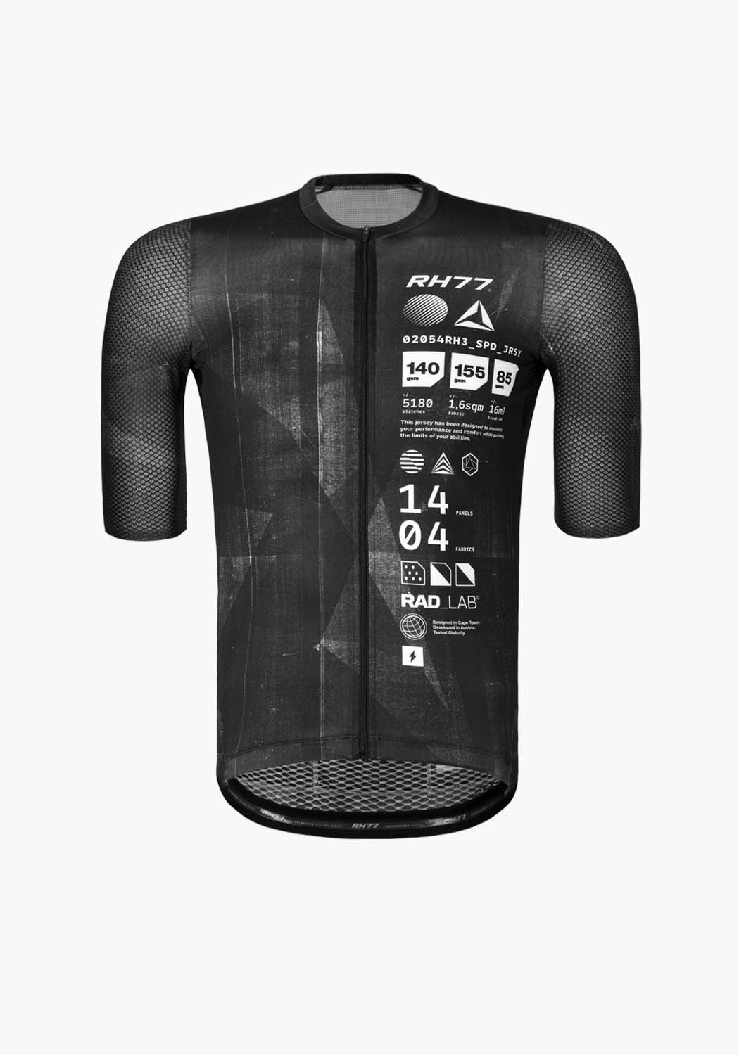 The design displays the breakdown of the garment, giving some understanding of what technical process takes place during the construction of this RH77 Superspeed Jersey.