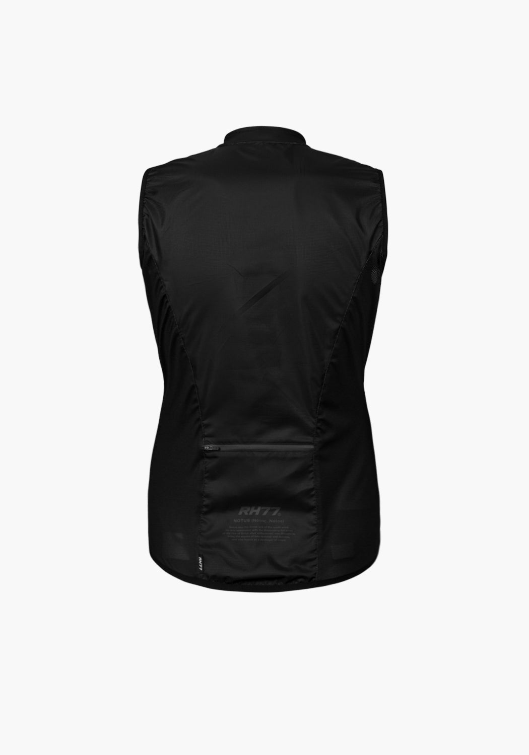 This is our Notus BLCK Gilet, impressive with the design in black. This "wind breaker" is easy to store in a jersey pocket. The left and right mesh panels regulate the climate. The gilet offers a unique aero fit.