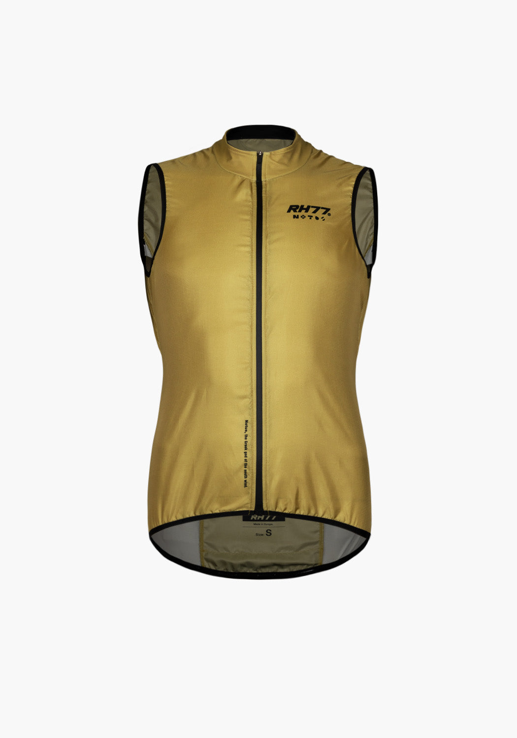 This is our Notus Gilet, impressive with the design in gold. This "wind breaker" is easy to store in a jersey pocket. The left and right mesh panels regulate the climate. The gilet offers a unique aero fit.