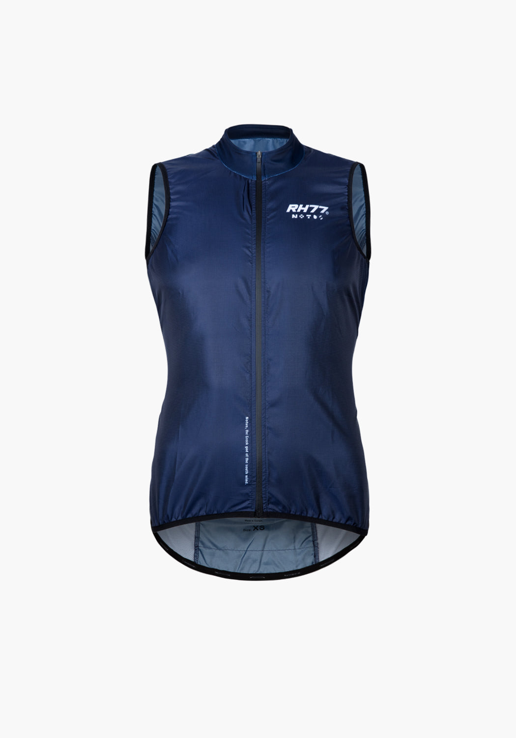 This is our Notus Gilet , impressive with the design in navy blue. This "wind breaker" is easy to store in a jersey pocket. The left and right mesh panels regulate the climate. The gilet offers a unique aero fit.